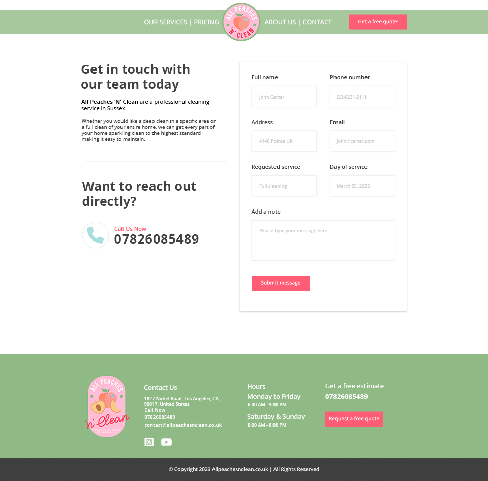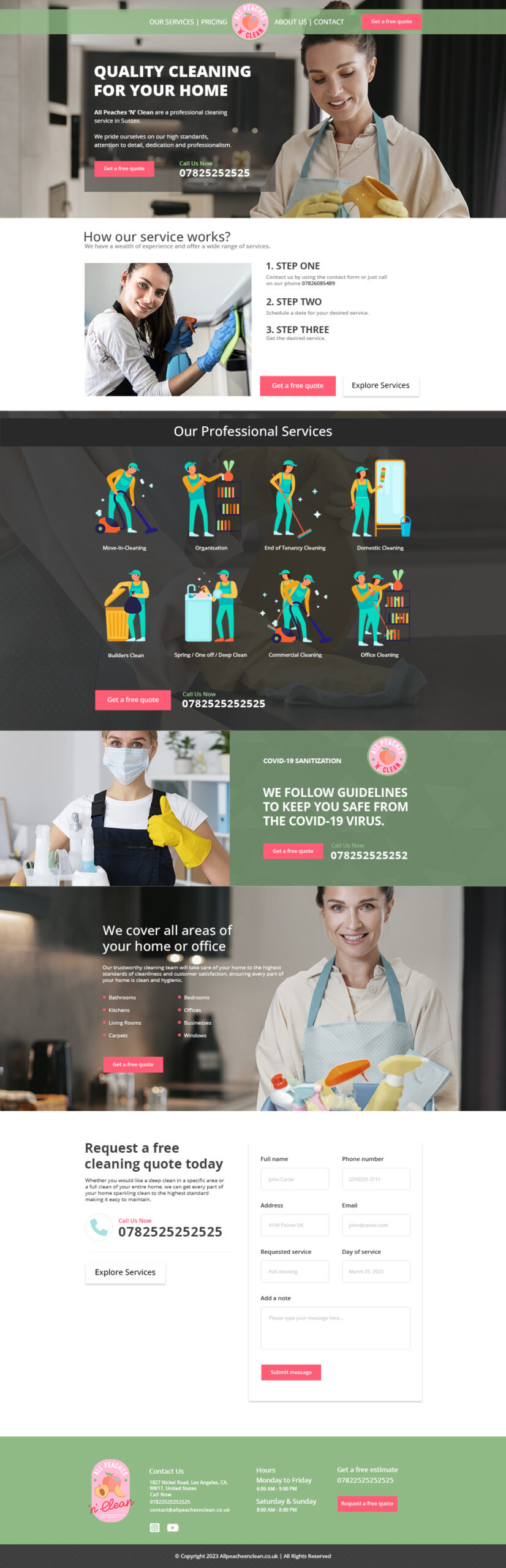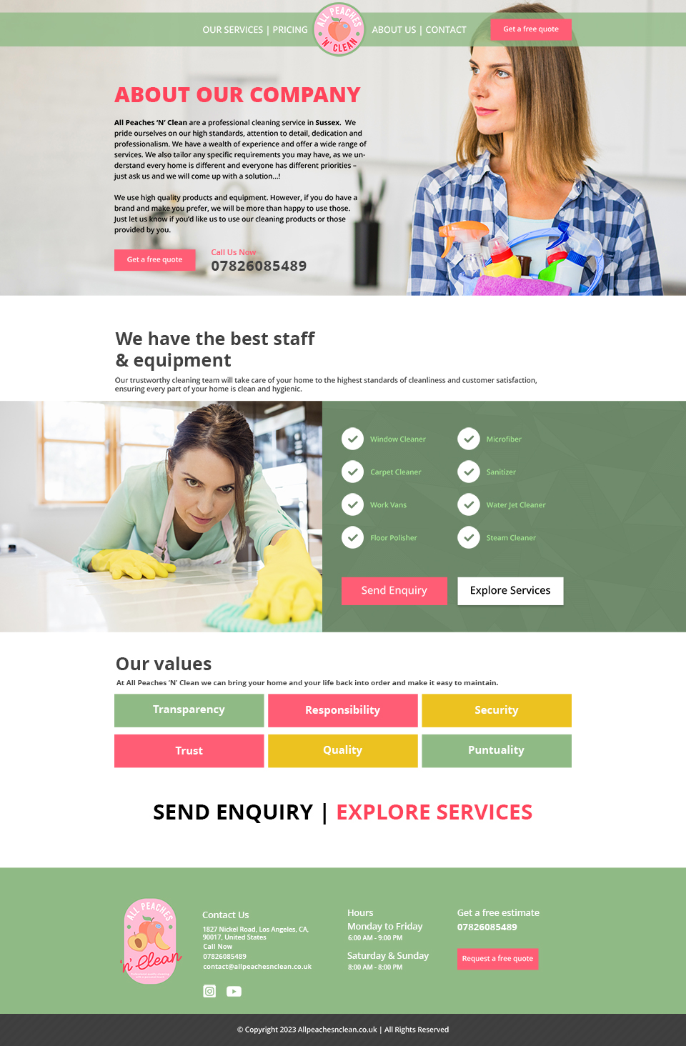 Introducing “All Peach & Clean,” a bespoke website crafted meticulously from scratch to mirror the pristine ethos of this distinguished cleaning service nestled in the heart of Sussex, England. This digital masterpiece seamlessly merges captivating graphics with meticulously curated content, offering visitors an immersive journey into the realm of cleanliness and sophistication. With a keen eye for detail, every pixel of the website reflects the commitment to excellence that defines All Peach & Clean. From the sleek design elements to the engaging narratives, each facet of the site harmoniously coalesces to evoke a sense of reliability and professionalism. Whether one seeks domestic bliss or commercial brilliance, this digital abode serves as a gateway to unparalleled cleanliness and unparalleled service.