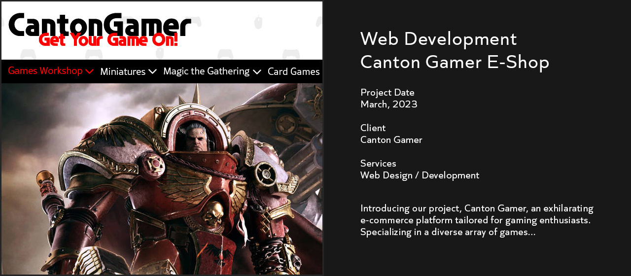 Introducing our project, Canton Gamer, an exhilarating e-commerce platform tailored for gaming enthusiasts. Specializing in a diverse array of games, including popular tabletop favorites like Warhammer 40K, Malifaux, and Yu-Gi-Oh, the website offers a captivating destination for gamers of all stripes. Working on this project was a delight, as our team shares a genuine passion for gaming. It was a pleasure to collaborate closely with the client, blending their instructions with our expertise and infusing the site with our own unique flair. As fellow fans of the gaming world, crafting the Canton Gamer website was not just a project—it was a labor of love and a celebration of our shared passion for games.