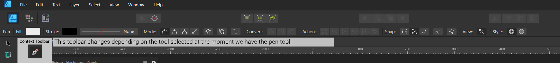 The Tools panel is presented vertically on the left side of your workspace. It contains all the tools available in the currently active Persona (Designer, Pixel, or Export).